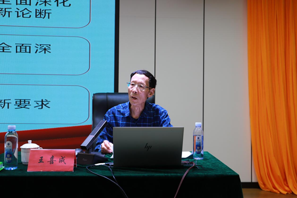 王喜成教授作题为《锚定全面深化改革 奋力推进中国式现代化的集结号》的报告。他从深刻理解把握党的二十届三中全会的重大意义、深入学习领会习近平总书记在党的二十届三中全会上的重要讲话精神、全面准确理解《中共中央关于进一步全面深化改革、推进中国式现代化的决定》提出的重大改革举措等方面对党的二十届三中全会精神进行了深入讲解和阐释。会上,王喜成围绕全会对深化教育改革的新要求为我校教育事业发展提出四点建议,一是要着力完善立德树人机制,坚持不懈用习近平新时代中国特色社会主义思想铸魂育人,推进思政课一体化改革创新,持续深化学生体质强健计划、学校美育浸润行动、劳动习惯养成计划、学生心理健康促进行动等,切实为党育人、为国育才;二是要充分发挥高校人才聚集优势,重点聚焦人才自主培养能力提升、支撑高水平科技自立自强、服务国家经济社会发展战略等方面的作用,通过深化改革,培养出以颠覆性技术和前沿技术催生新产业、新模式、新动能的创新人才,让掌握科学技术前沿的科技人才领衔育人,实现高校、科技与产业体系的育人融合,助力提升国家创新体系整体效能;三是要着力建设高素质专业化教师队伍,引导广大教师弘扬践行教育家精神,健全师德师风建设长效机制;四是要树牢一切为了教学、一切为了科研的导向,持续深化教学科研、人才培养、成果评价等体制机制改革。