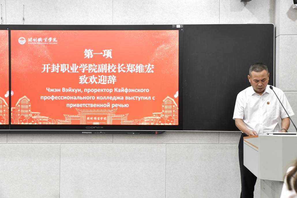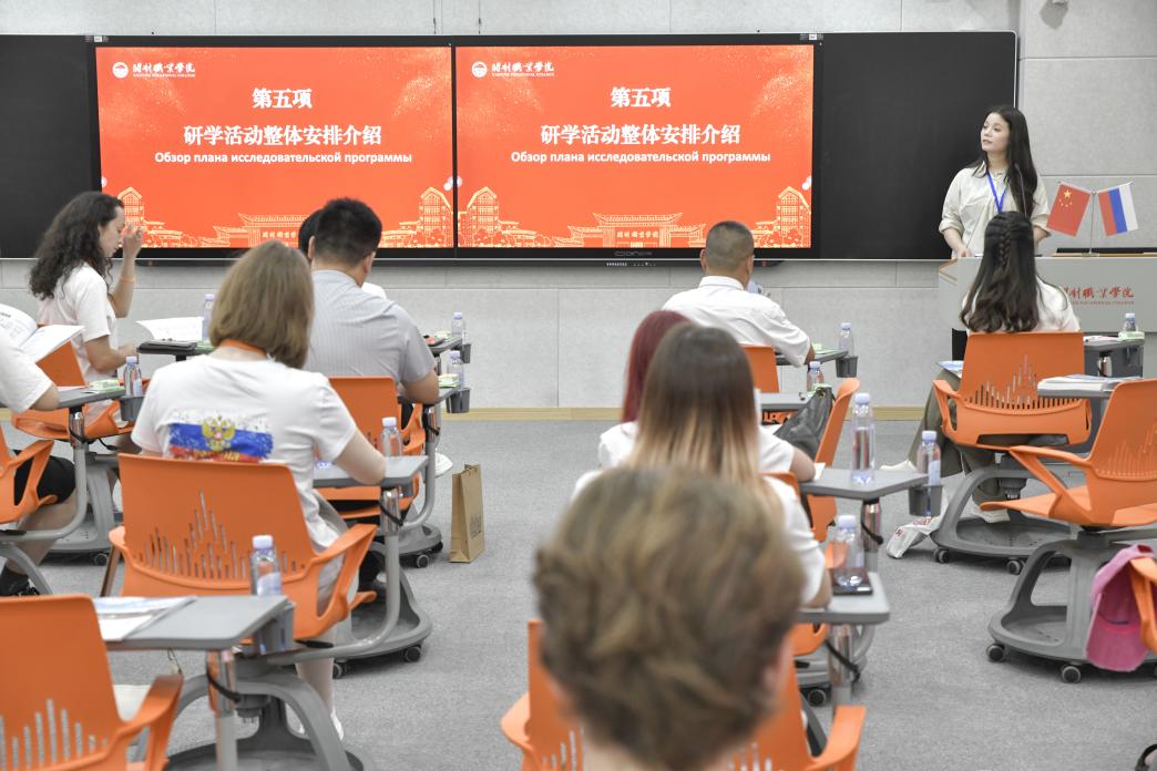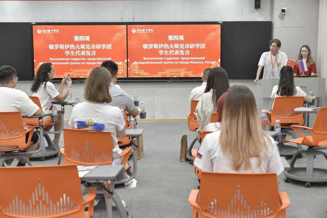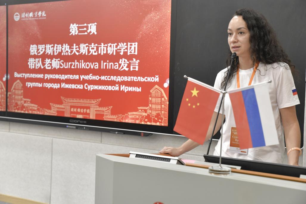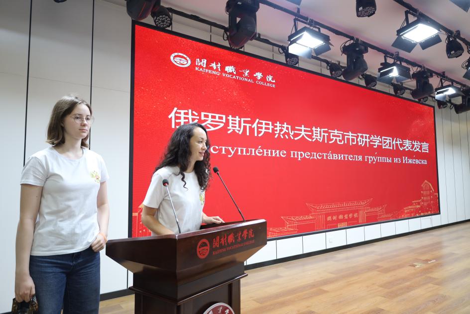 7月15日,活动正式拉开帷幕,当天在毕昇楼二楼智慧教室举行开班仪式,常务副校长刘珊珊、副校长郑维宏和有关部门负责人及俄罗斯伊热夫斯克市研学团参加仪式。仪式上,郑维宏致欢迎辞,对俄罗斯代表团的到来表示热烈欢迎,强调了此次活动对中俄文化交流的重要意义。校党委委员、组织部部长高云龙从学校高起点的建设、有梦想和追求的办学理念、尊重师生的育人氛围以及趣韵满园的校园生活四个方面介绍了开封职业学院的基本情况,让代表团成员对学校有了全面了解。俄罗斯带队老师Surzhikova Irina及学生代表分别表达了对中国文化的期待与感谢。