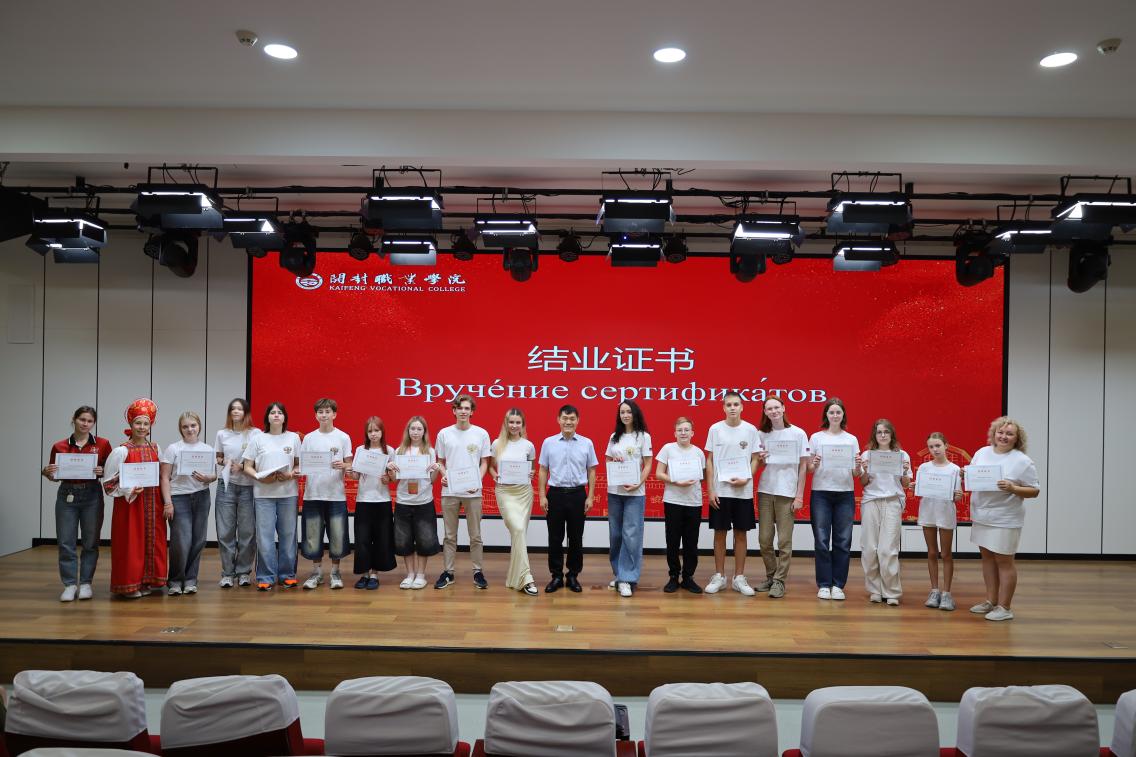 7月22日的结业仪式上,副校长李光奇对研学活动的成功举办表示祝贺,并肯定了活动在中俄文化交流中发挥的积极作用。俄罗斯伊热夫斯克市研学团代表发言,分享了此次研学的收获与感悟。结业仪式充满了温情与欢乐,中俄师生共同表演了文艺节目,包括京歌《梨花颂》、诗歌朗诵《将进酒》以及俄罗斯民族舞蹈《Kalinka-malinka》。最后,全体合唱《茉莉花》,将气氛推向高潮。李光奇为所有俄罗斯学员颁发了由开封职业学院与非遗传承人联名认证的传统非遗项目结业证书,标志着活动圆满结束。