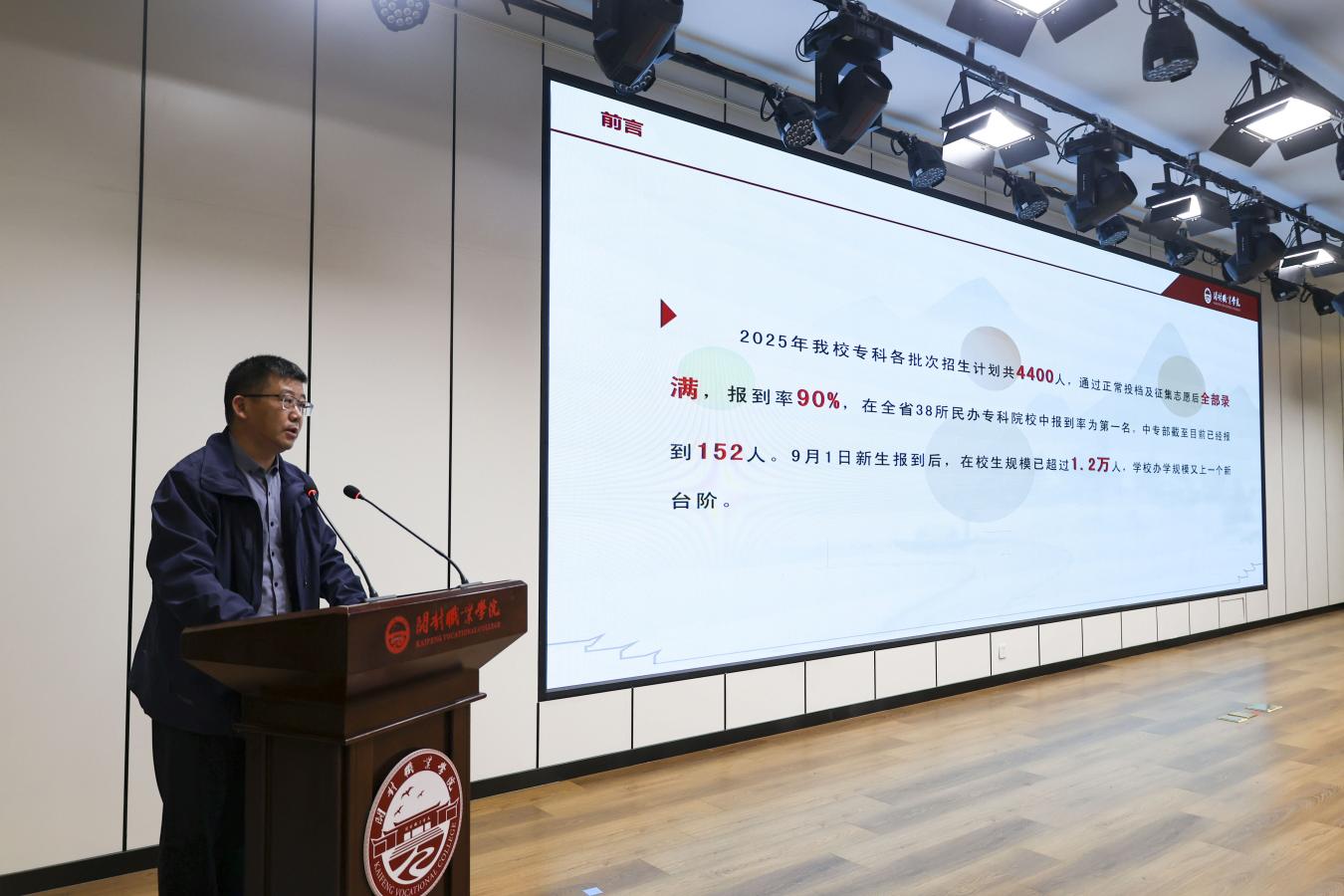 招生办公室主任李保华作2025年招生工作总结报告。他指出,面对复杂多变的外部环境与日益激烈的竞争态势,学校科学研判、精准谋划,圆满完成了年度招生任务,整体报到情况在省内同类院校中保持良好态势,在校生规模稳步提升。报告系统分析了以线上宣传为主导、线下精准推进、全员协同配合的立体化招生策略的实施成效,并就工作中需要改进的环节提出了建设性意见。