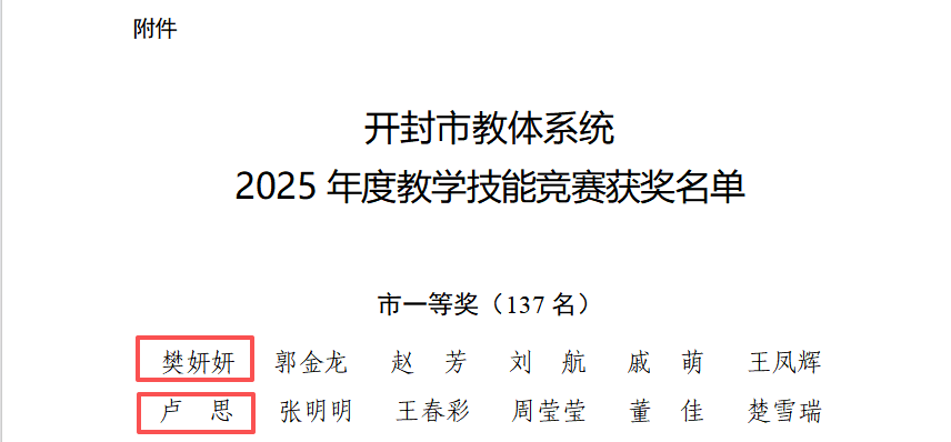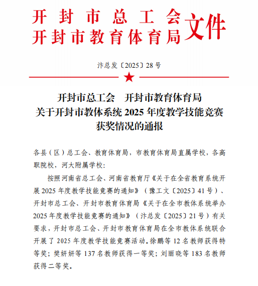近日,开封市总工会、开封市教育体育局下发了《关于开封市教体系统2025年度教学技能竞赛获奖情况的通报》(汴总发〔2025〕28号),公布了2025年开封市教学技能竞赛获奖名单。我校教师樊妍妍、卢思获得市一等奖,刘丽晓、刘阳获得市二等奖。