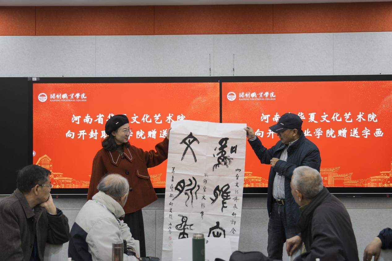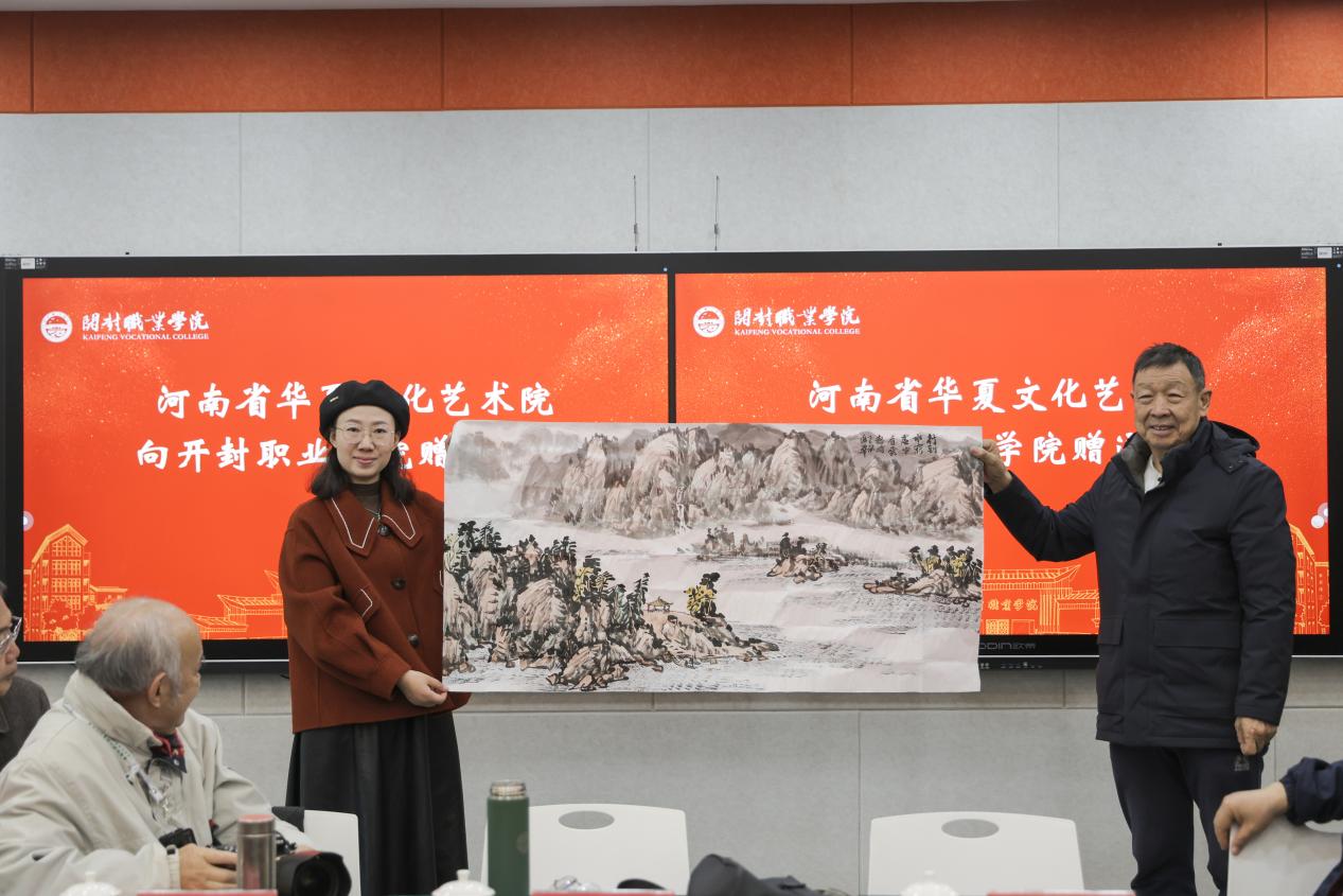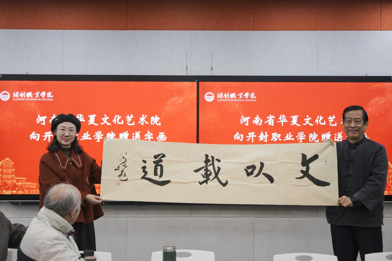 会上,河南省华夏文化艺术院向我校赠送了珍贵书画作品,一是河南省华夏文化艺术院院长、著名书法家海萌辉教授的大篆“风雅宋,文脉隽”作品,二是河南省华夏文化艺术院常务副院长、著名书法家周首林的楷书“文以载道”作品,三是河南省华夏文化艺术院副院长、画院院长张培华的山水画。墨宝飘香间彰显着文化传承的深厚情谊。