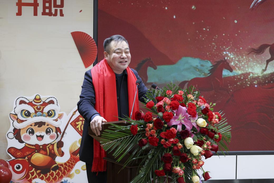 校长徐仲昆发表新春致辞,借“瑞雪兆丰年”的美好寓意向全体教职工致以诚挚新春祝福,叮嘱大家在假期休整蓄力、谋划来年。他重点谈到了学校鼓励师生创新创业的宏伟构想,同步公布了支持教师组建产教融合创新团队等激励政策与一系列暖心保障,并以2026年度关键词“不弃”为勉,号召全体教职工铭记教育初心、勇克发展难题,与学校相互尊重、双向奔赴、同频共振。随后,执行校长刘珊珊主持新春团拜环节,校领导班子的殷切关怀与同事间的暖心问候让现场暖意融融。