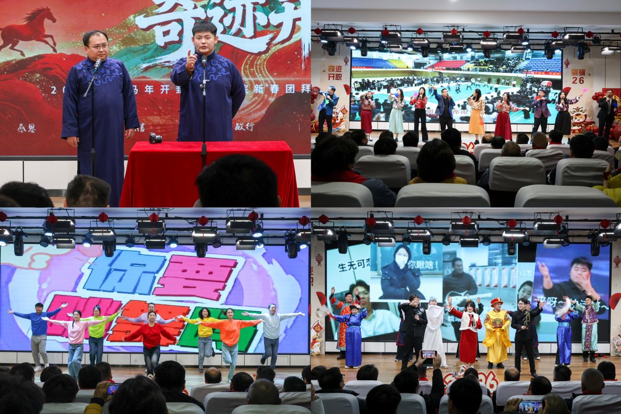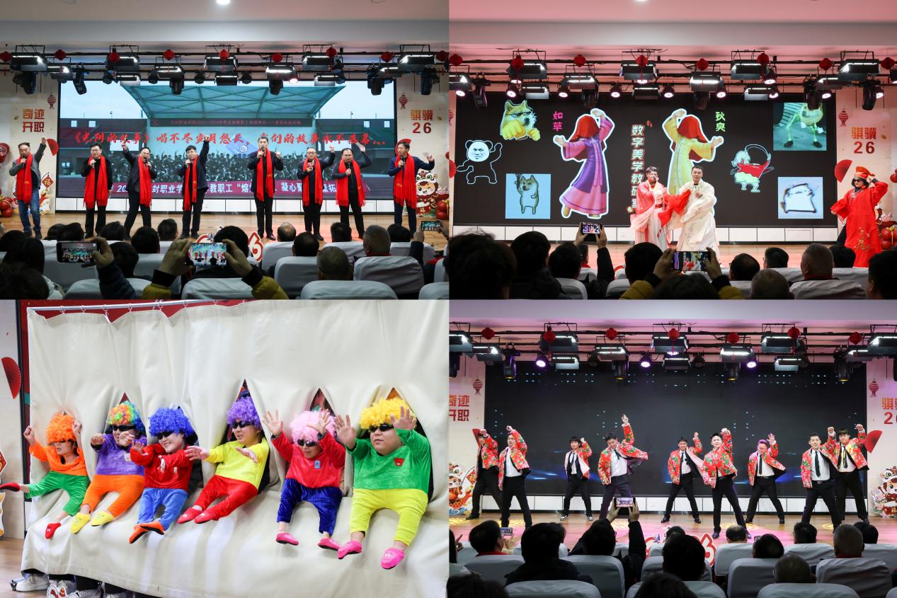 文艺表演环节好戏连台,歌伴舞《上春山》尽显春日盎然生机;歌舞《开职越来越好》以彩扇飞扬绘就发展蓝图;三句半《开职开新篇》用接地气的幽默讲好开职故事;歌·舞·戏《喜乐风华·歌韵轿影》巧妙融合流行音乐、动画元素与传统豫剧;原创相声《我要收徒》包袱不断,引得全场欢笑连连;舞蹈《一起跳舞吧》以动感舞步展现青春朝气;合唱《朋友》用温情旋律诉说同事间的深厚情谊;歌舞《当》以饱满热情诠释开职人的坚守与陪伴;校工会老男孩合唱团用《光阴的故事》回望岁月沉淀的美好;人偶表演《妙手偶得》用灵动肢体解锁欢乐;《师者·秀场》尽显教师们多才多艺的别样风采;体育舞蹈《嗨,你好!》以飒爽舞姿搭配动感节奏,点燃全场活力。其间,远赴国外求学的教师代表发来拜年视频,2025届毕业生代表也从大江南北送上云端祝福,跨越山海的牵挂与惦念让现场更添温情。