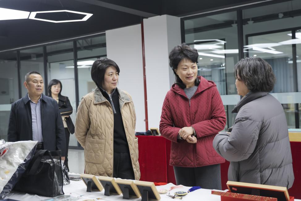 赵洁一行前往文化旅游学院,先后调研了华育中航联合育人基地、旅游服务实训中心、数字媒体工作坊等地,重点围绕汴绣产业从人才培养、产品研发到市场转化的全链条发展情况开展实地考察。赵洁一行走进汴绣非遗工作室,详细了解学校刺绣设计与工艺专业的系统化人才培养成效,对学校“非遗进课堂、技艺进专业、文化浸润人”的创新做法给予充分肯定;在文创中心汴绣作品展示区,观摩了融合现代设计的汴绣文创产品、数媒融合汴绣作品、专业师生国赛省赛获奖设计作品等各类成果;最后,赵洁一行来到京东数字经济产业学院,重点了解学校依托跨境电商运营渠道打造的汴绣相关国际贸易项目,并就项目运营模式、国际市场需求,以及借助开封海关通关优势不断优化国际市场路径等问题与学校进行了深入交流。