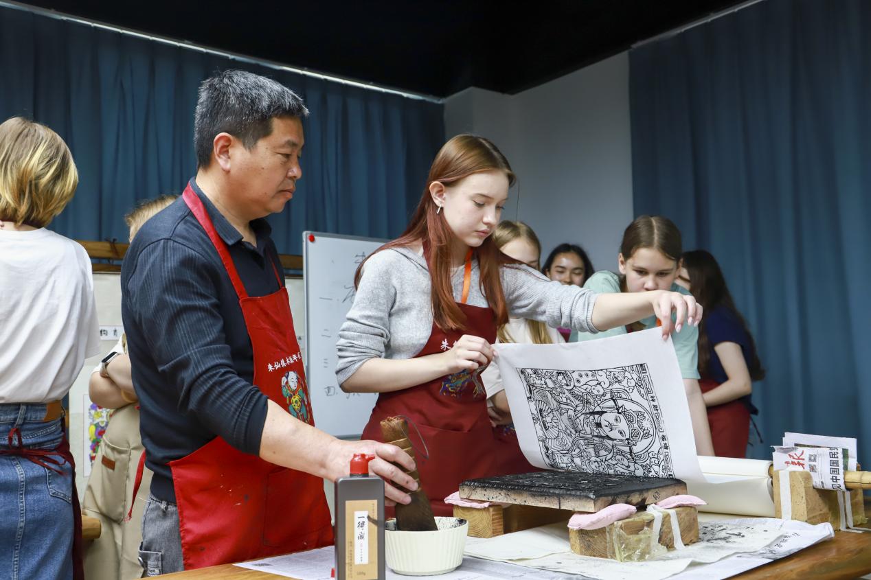 研学期间,俄罗斯学子深度体验了中华优秀传统文化。他们在书法课堂上领略汉字结构之美,在汴绣技艺、北宋官瓷、朱仙镇木版年画等非遗体验中触摸千年前的宋韵风华,在中医推拿、手工泥塑等传统技艺项目里感受中原文化特色。